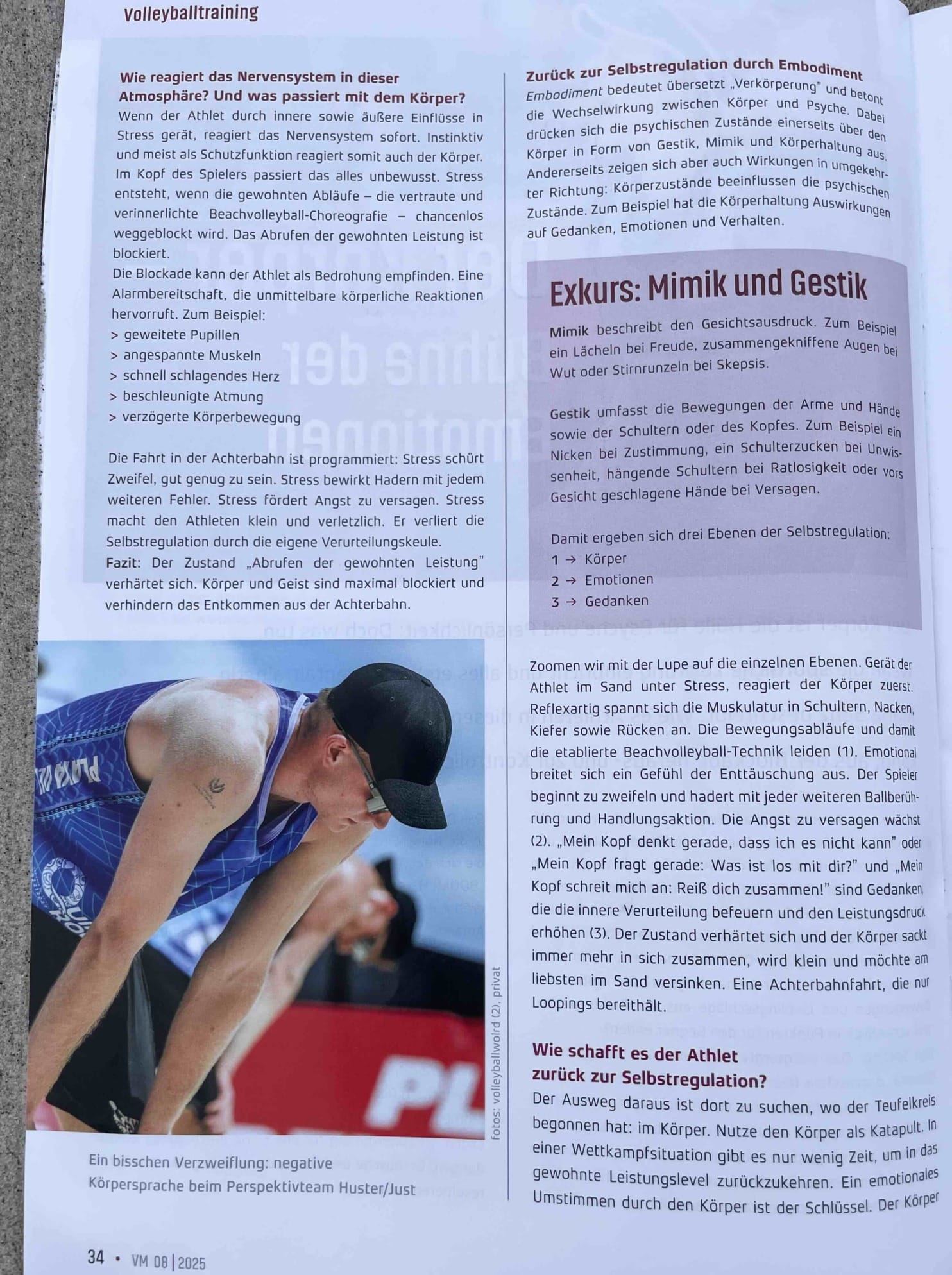 Zoomen wir mit der Lupe auf die einzelnen Ebenen. Gerät der Athlet im Sand unter Stress, reagiert der Körper zuerst. (1) Reflexartig spannt sich die Muskulatur in Schulter, Nacken, Kiefer sowie Rücken an. Die Bewegungsabläufe und damit die bewährte Beachvolleyballtechnik leidet. (2) Emotional breitet sich ein Gefühl der Enttäuschung aus. Der Athlet beginnt zu zweifeln und hadert mit jeder weiteren Ballberührung und Handlungsaktion. Die Angst zu versagen wächst. (3) „Mein Kopf denkt gerade, dass ich es nicht kann.", „Mein Kopf fragt gerade: Was ist los mit dir, ey?", „Mein Kopf schreit mich an: Reiß dich zusammen!" sind Gedanken, die die innere Verurteilung befeuern und den Leistungsdruck erhöhen. Der Zustand verhärtet sich und der Körper sackt immer mehr in sich zusammen. Wird klein und möchte am liebsten im Sand versinken. Eine Achterbahnfahrt, die nur Loopings bereithält.