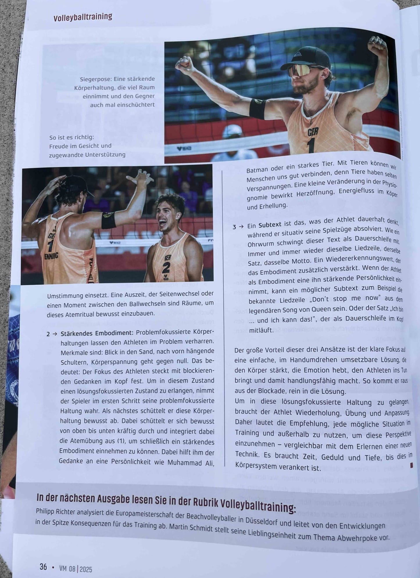 (2) Stärkendes Embodiment: Problemfokussierte Körperhaltungen halten den Athleten im Problem fest. Blick in den Sand, Schultern hängen nach vorne, Körperspannung geht gegen null und der Fokus steckt im Kopf mit blockierenden Gedanken fest. Um einen lösungsfokussierten Zustand zu erlangen, nimmt der Athlet im ersten Schritt seine problemfokussierte Haltung wahr. Als nächstes schüttelt er bewusst diese Körperhaltung ab – von oben bis unten kräftig durchschütteln und dabei die Atem-Übung aus (1) integrieren. Um schließlich ein stärkendes Embodiment einnehmen zu können. Das kann eine (fiktive) Persönlichkeit sein, z.B. Muhammad Ali, Laura Ludwig oder Batman. Das kann auch ein stärkendes Tier sein. Mit Tieren können wir Menschen uns gut verbinden und Tiere haben selten Verspannungen. Eine kleine Veränderung in der Physionomie bewirkt Herzöffnung, Energiefluss im Köper und Erhellung.