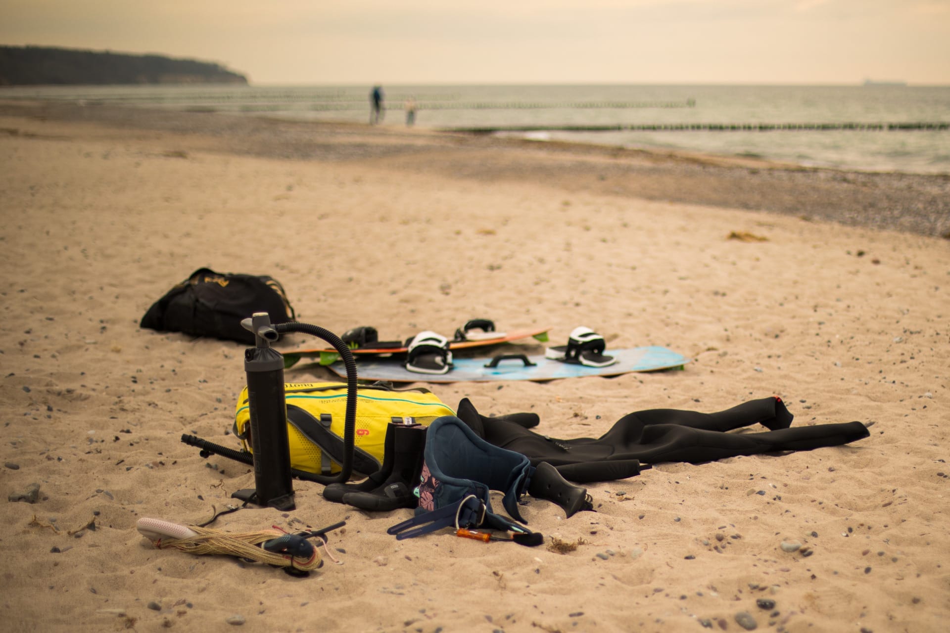 Arbeitsmaterialien sowie die Ausstattung zum Kitesurfen.